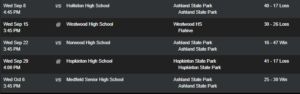 TVL Football Holliston 28, Millis 7 Dover-Sherborn 41, Weston 13 Norton 47, Medway 7 Medfield 21, Dedham 6 Ashland 34, Franklin County 6 Wayland 16, Hopkinton 14 Hanover 24, Westwood 8