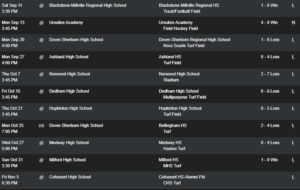 Football Westwood – 8 @ Falmouth – 34 Bellingham – 32 @ Bishop Stang – 20 Norton – 13 @ Ashland – 16 Nipmuc – 13 @ Dover-Sherborn – 14 Lincoln-Sudbury – 20 @ Holliston – 30 Hopkinton – 26 @ Medway – 11 Medfield – 26 @ Winthrop – 0 Archbishop Williams – 22 […]