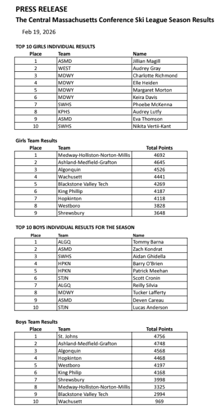 Below is the final results for the Central Massachusetts Conference Ski League. Included is top 10 Girls, top 10 Boys, and the end of season final results.