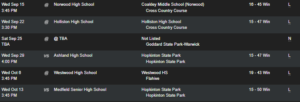 Boys Cross Country (5-1) Wed 9/7/16 3:30 PM VS Hopkinton (L 37-22) Wed 9/14/16 3:30 PM VS Millis (W 15-40) Wed 9/21/16 3:30 PM @ Dover-Sherborn (W 25-31) Wed 9/28/16 3:30 PM @ Medway (W 18-43) Wed 10/5/16 3:30 PM @ Ashland (W 20-43) Thu 10/13/16 3:30 PM VS Holliston (W 22-34) Wed 10/26/16 3:00 […]