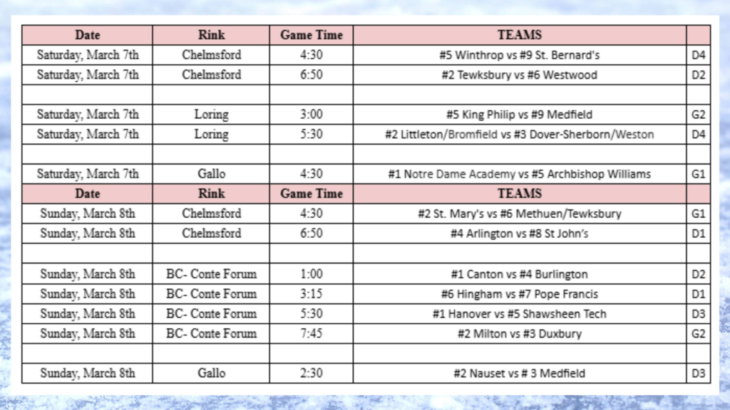 Below, view the full MIAA State Tournament semi-finals hockey schedule featuring 4 Tri-Valley League (TVL) programs!