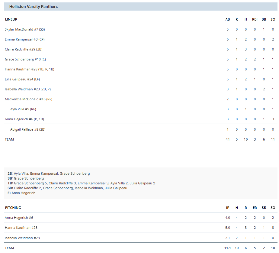 Holliston went up 5-2 in the top of the 8th after Julia Galipeau stole home, Isabella Weidman & Anna Hegerich reached home plate for runs in the same sequence on a wild pitch & passed ball.