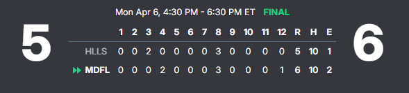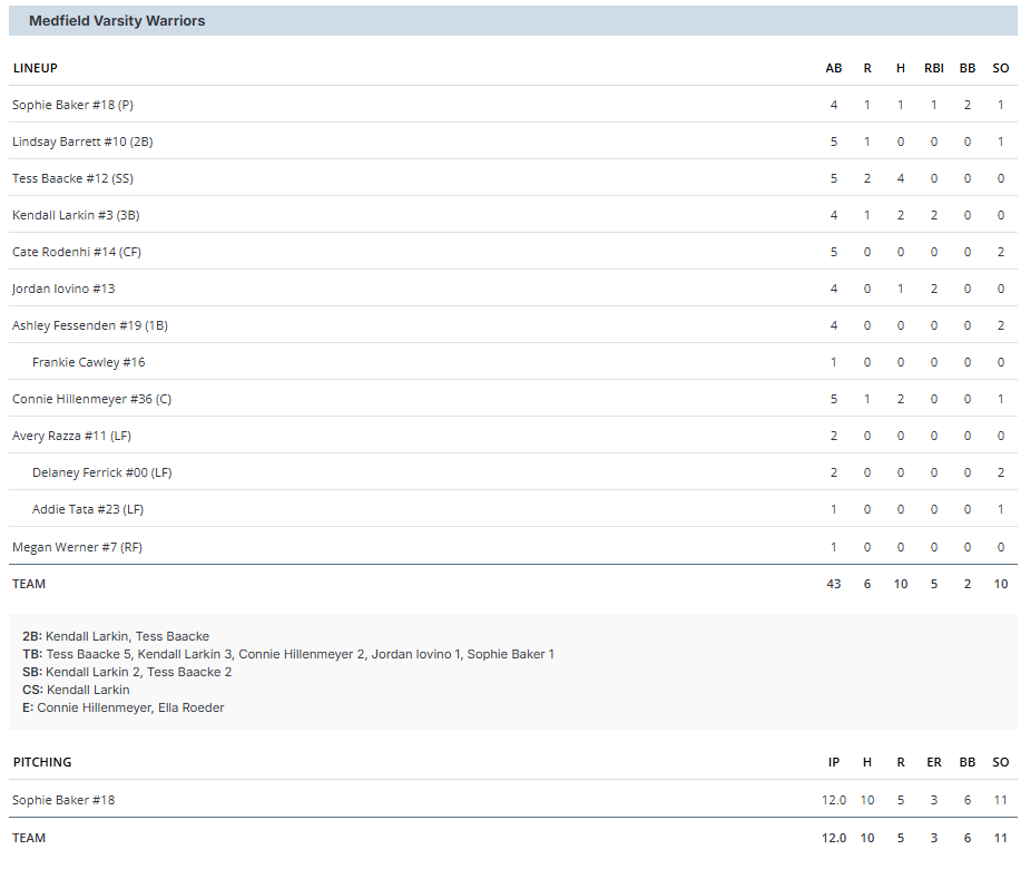 No more runs would score until the bottom of the 12th where Sophie Baker singled to drive in Connie Hillenmeyer for the walk-off extra innings winning run and take the game for Medfield 6 to 5.