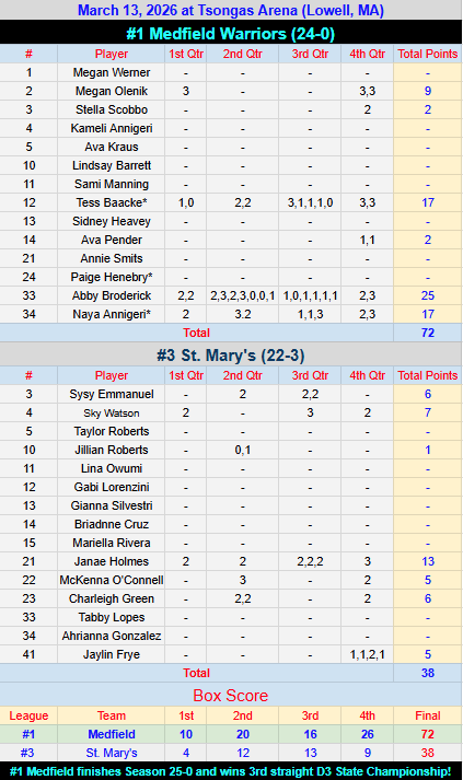25-26: Medfield defeats St. Mary’s 72-38 (Record: 25-0)